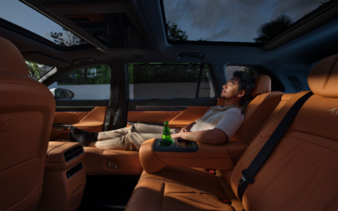 如果說空間大只是eπ008的基礎素質,那么它的"變身能力"則堪稱黑科技。eπ008五座版配備二排電動魔毯座椅,四分、六分腿托可單獨調節,后排腿托完全升起就能形成一個1.5米長的休息空間;長途旅行時,副駕放平配合后排左側腿托升起,能形成同級最長2m+副駕L型貴妃榻,寶媽可以陪著孩子一起休息;最神奇的是,后排座椅完全放倒后,車內瞬間變成同級唯一2.4米超大雙人床,SUV秒變房車,露營時一家人可以在車里看星星。