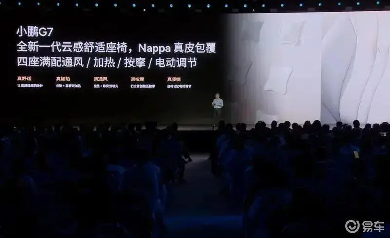 小鵬G7配備了載全新一代云感舒適座椅,采用Nappa真皮包覆,并擁有四座滿(mǎn)配通風(fēng)、加熱、按摩以及電動(dòng)調(diào)節(jié)功能。