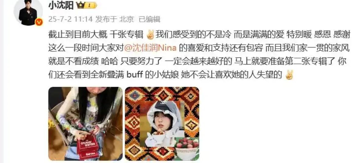 9月2號中午小沈陽來給女兒發文助力了,說截止目前已經賣了有千張專輯了,馬上第二張專輯也要出來了,而且我們家一貫作風不看成績,只要努力了就行