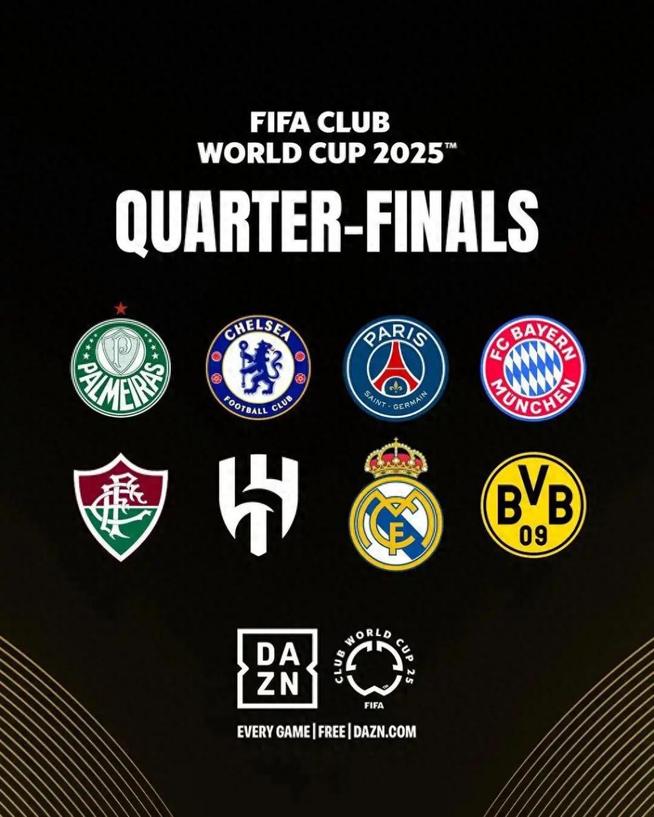 世俱杯八強球隊具體分別是弗魯米嫩塞(巴西)、利雅得新月(沙特)、帕爾梅拉斯(巴西)、切爾西(英格蘭)、巴黎圣日耳曼(法國)、拜仁慕尼黑(德國)、皇家馬德里(西班牙)、多特蒙德(德國)。四分之一決賽的對陣如下: