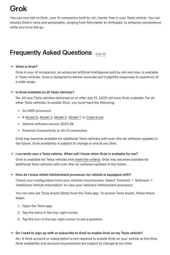 具體來說,Grok被推送給符合條件的特斯拉車輛,目前支持搭載AMD信息娛樂處理器且運(yùn)行2025.26及以上版本車載軟件的車型,包括Model S、Model 3、Model X、Model Y和Cybertruck。