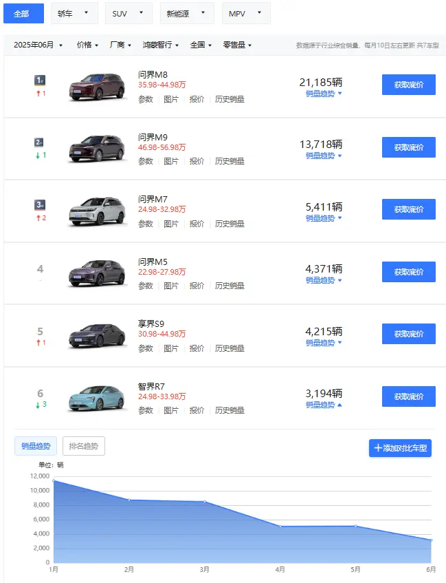但當初上市33天大定破3萬的智界R7就有點不甚理想了,6月只賣出了2459 輛,6個月持續下滑,再跌就要糊了。