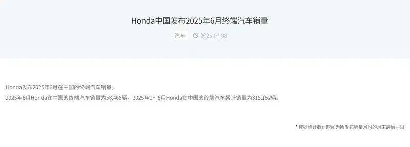 今日,中國正式公布了2025年6月終端汽車銷量數據,當月銷量為58468輛。今年1~6月,本田在中國的終端汽車累計銷量達到315152輛。