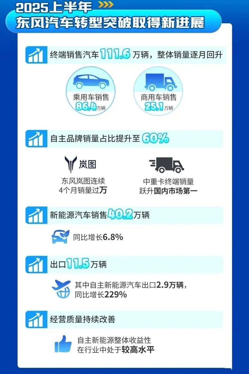 東風汽車今年上半年終端銷售汽車111.6萬輛,自主品牌銷量占比提升至60%,嵐圖品牌連續4個月過萬;新能源汽車銷量40.2萬輛,同比增長6.8%;出口11.5萬輛,其中自主新能源汽車出口2.9萬輛,同比增長229%。
