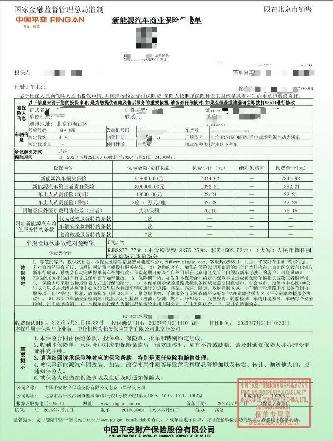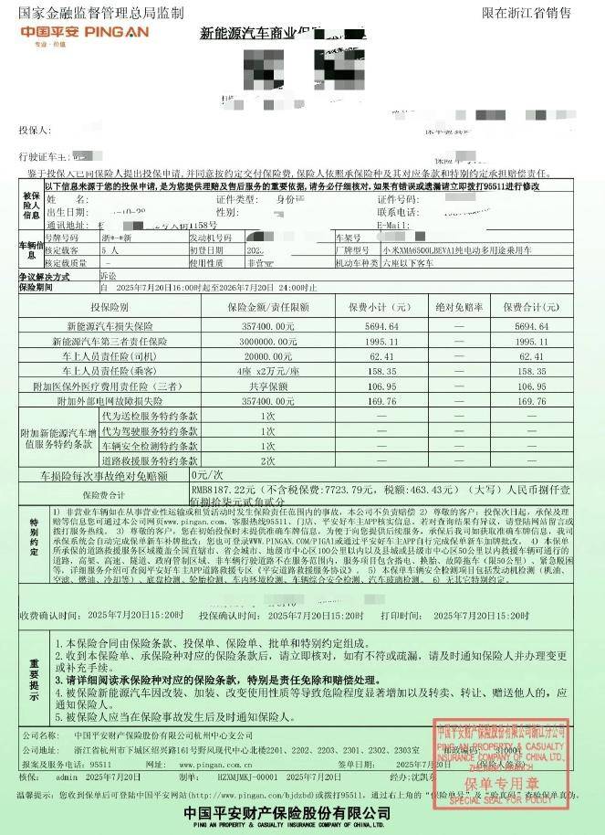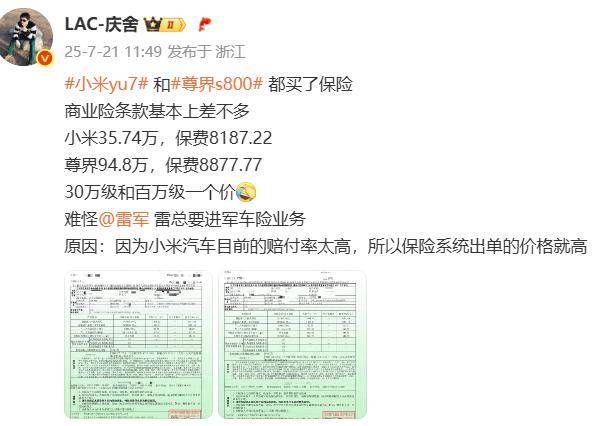 7月21日,一位同時購買了小米YU7和尊界S800的博主在社交媒體上曬出了這兩款車型的保險費用。令人震驚的是,30萬級的小米YU7和百萬級的尊界S800保險費居然差不多。