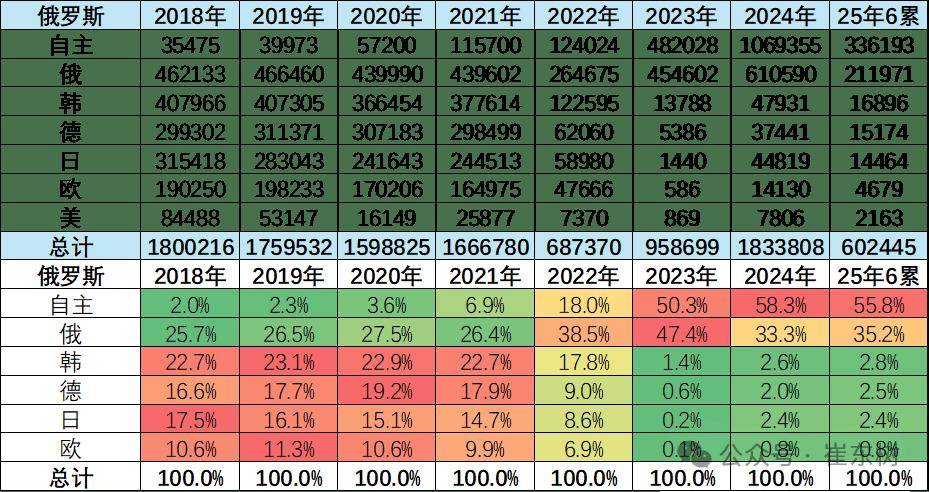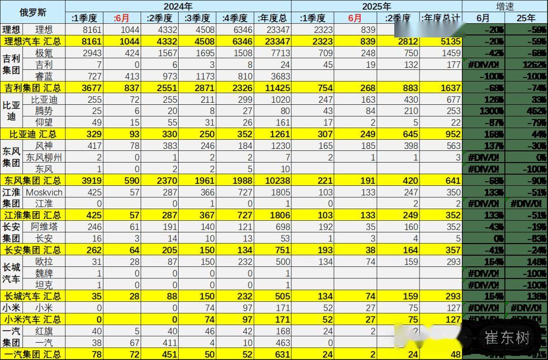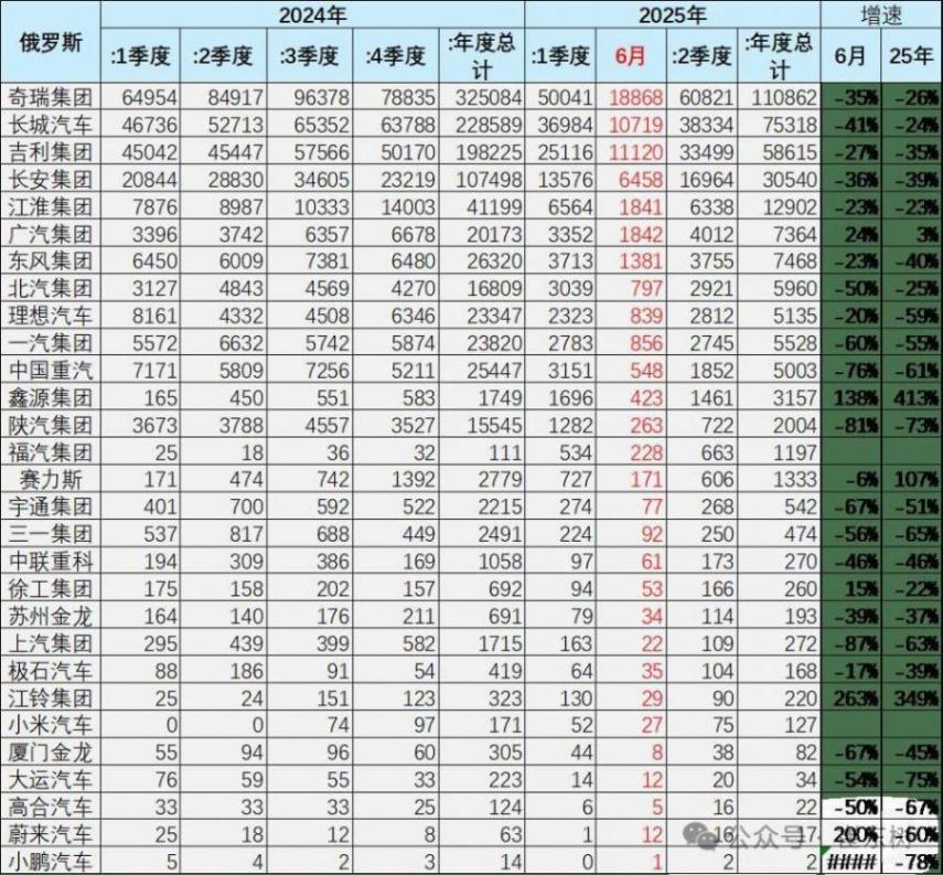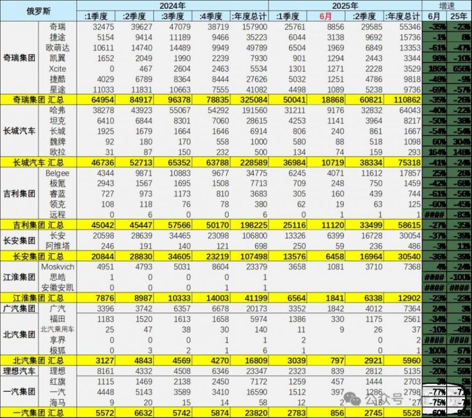 2023年中國出口俄羅斯100萬輛車,自主的俄羅斯市場銷量48萬輛,銷量是中國自主出口量的48%。2024年中國出口俄羅斯128萬輛車,自主的俄羅斯市場銷量107萬輛,自主的俄羅斯市場銷量是中國自主出口量的84%。2025年1-6月中國出口俄羅斯18萬輛車,自主品牌俄羅斯銷量34萬輛,當(dāng)?shù)劁N量是中國出口的187%,終于實現(xiàn)了大幅去庫存的走勢,化解風(fēng)險。