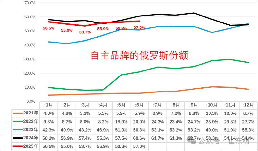 中國車企在2021年初在俄羅斯市場已經(jīng)逐步崛起的狀態(tài),但份額在5%左右;2023年中國車企抓住了俄羅斯國內(nèi)市場需求相對旺盛,而供給不足的特征,實現(xiàn)了突破50%的份額;2024年自主品牌在俄羅斯6-9月的月度份額又突破了60%的份額,實現(xiàn)了中國車企強勢增長的表現(xiàn),但2024年在4季度的自主份額持續(xù)下行;2025年1-6月微降到55%,6月自主車企在俄羅斯份額回升到57%。