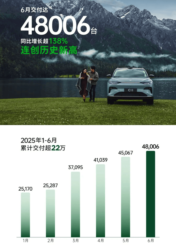 從已公布的銷量數據看,零跑成最大黑馬,上半年累計交付221664輛新車,同比增長達156%,首度登頂半年銷量榜。再看今年6月,零跑單月的全系交付量也已經來到4.8萬輛,同比增幅超過138%,創歷史新高。不過,零跑的逆襲有跡可循,自2024年起,零跑便進入高速增長期,2024年實現104%的顯著增長,2025年連續4個月蟬聯新勢力銷量冠軍。