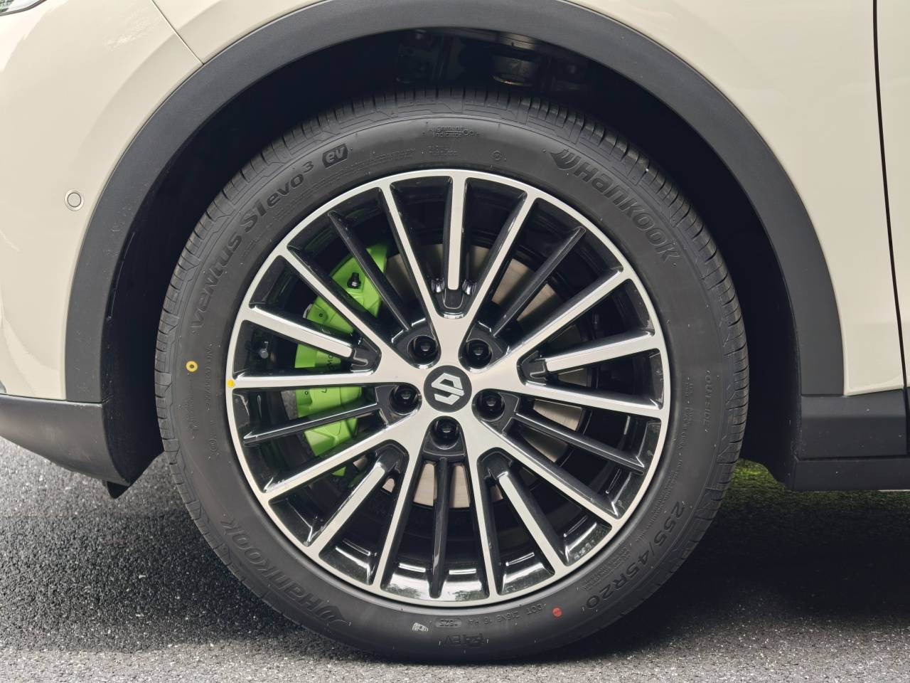 3、 新增霧凇米外觀色,外形上保留了經典的無框車門、隱藏式電動門把手、溜背曲線、凌風飾條,后窗也有隱私玻璃,讓人明顯覺得質感更好了。20英寸輪轂為全新設計,還升級了前四活塞卡鉗,做了淺綠色的性能涂裝。