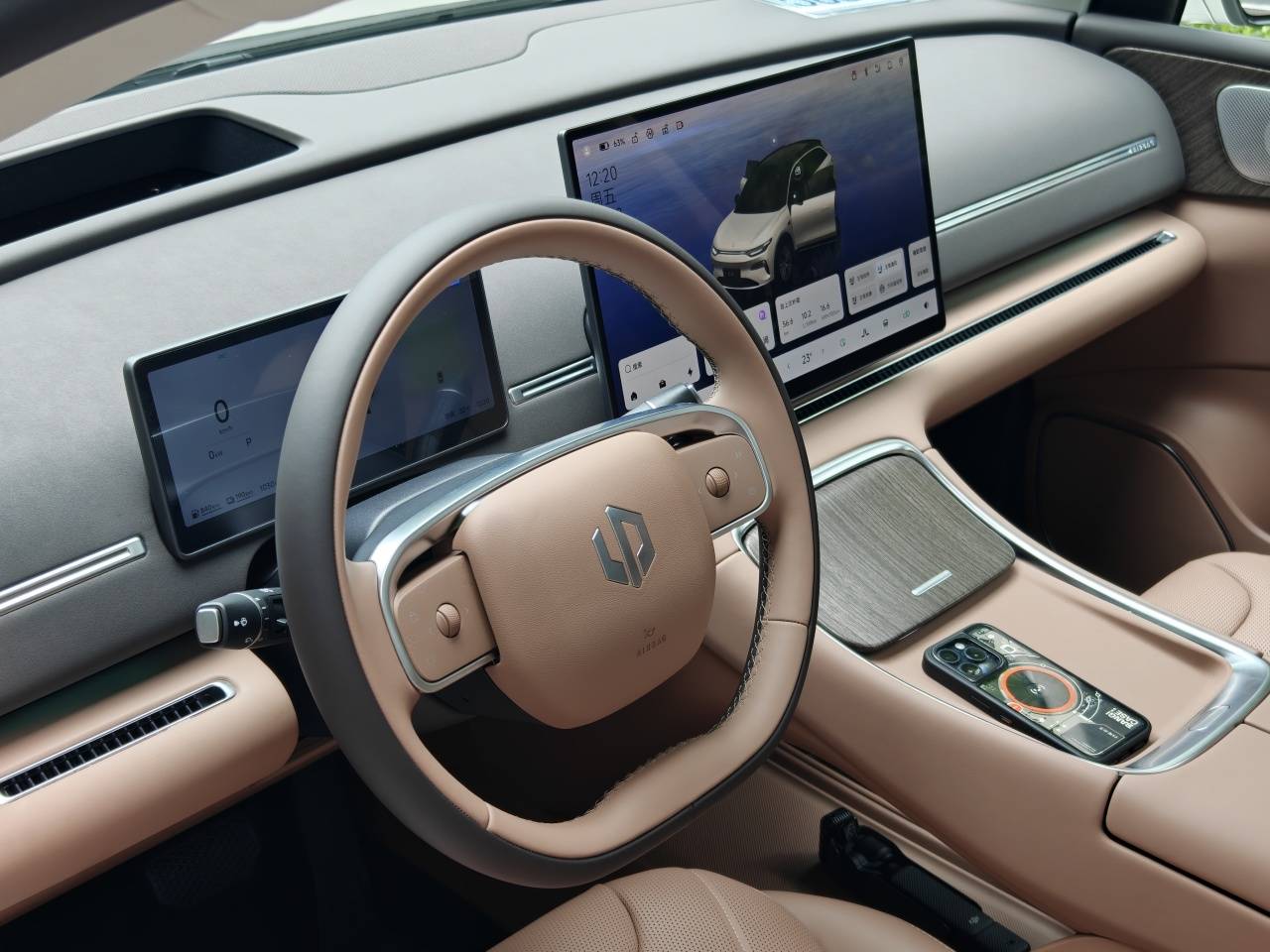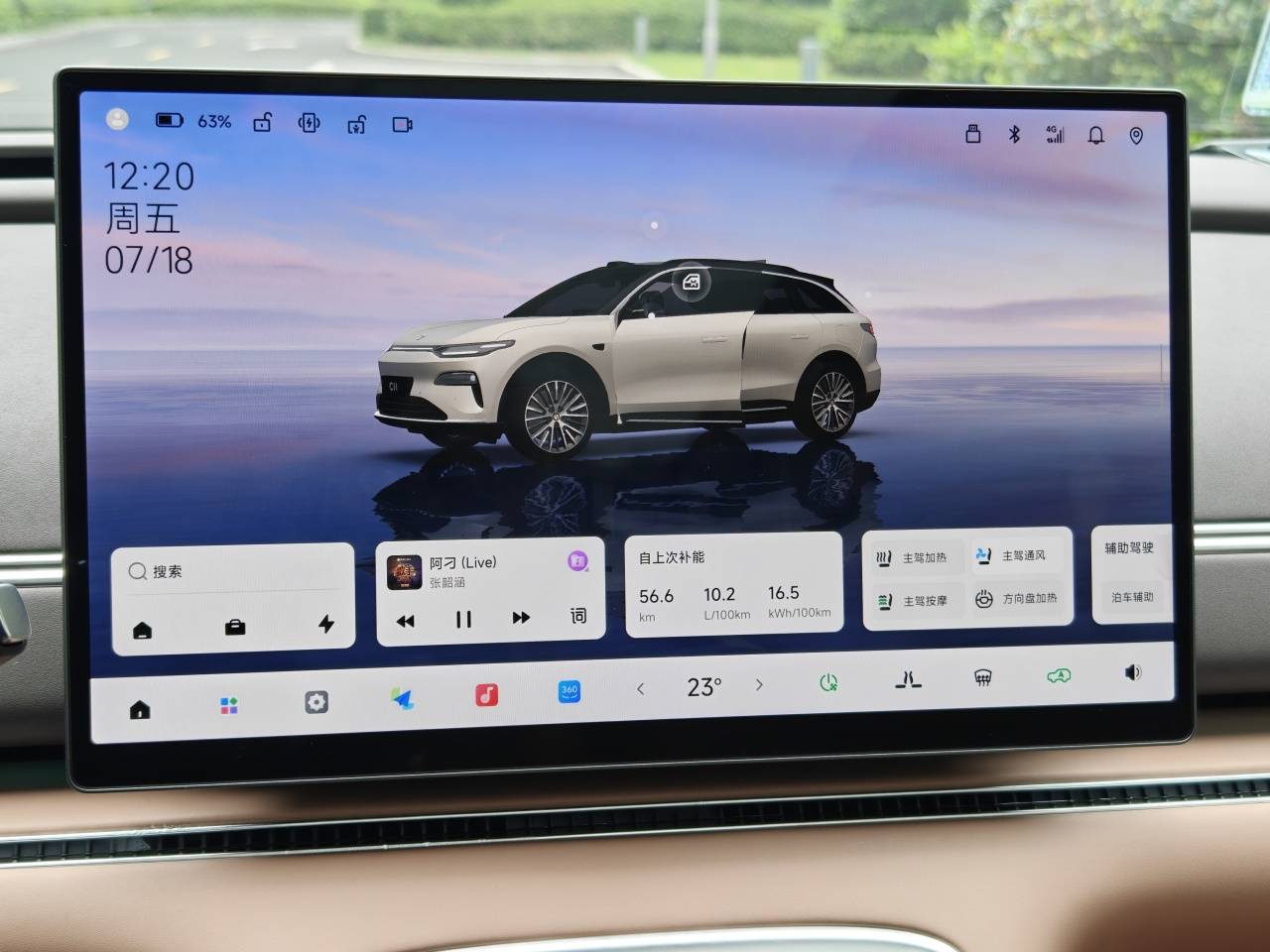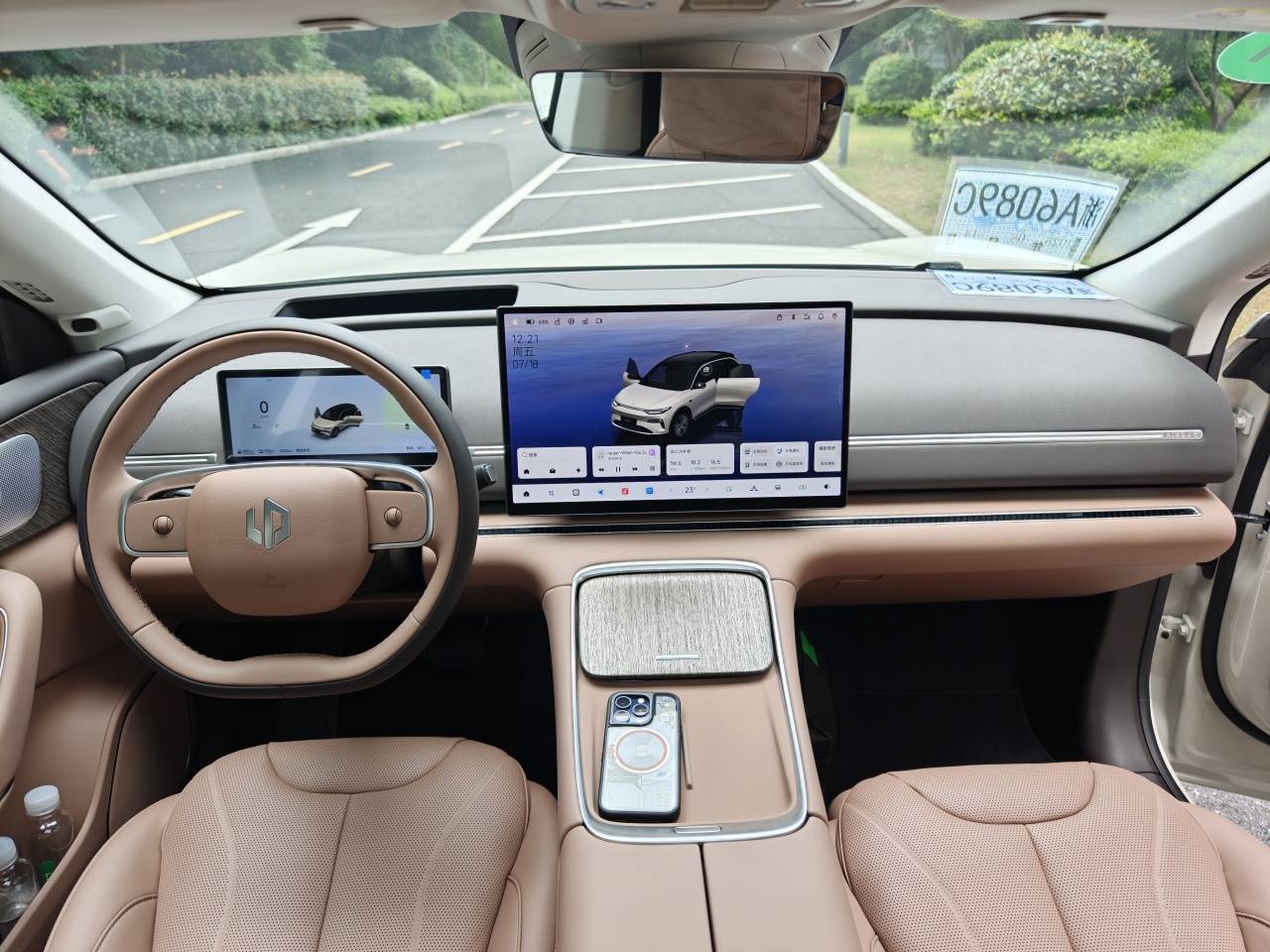 4、內飾變化更大一些,前IP臺取消了曾經的三塊屏幕,改為了10.25英寸液晶儀表+17.3英寸大屏的組合,還有一個自研的60英寸HUD,車內視覺效果主打一個“大”。此外采用了貫穿式電子式出風口設計,整體感更強。