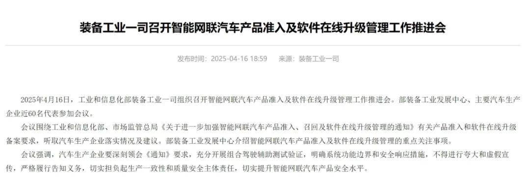然而,當(dāng)行業(yè)還沉浸在“全民智駕”的狂歡時(shí),上半年多次智駕事故風(fēng)波,最終還是引出了官方的監(jiān)管動(dòng)作。4月16日,工信部召開智能網(wǎng)聯(lián)汽車產(chǎn)品準(zhǔn)入及軟件在線升級管理工作推進(jìn)會(huì)。同時(shí),還流傳出了一份會(huì)議紀(jì)要。這次舉動(dòng)被認(rèn)為官方開始釋放對智駕監(jiān)管收緊的信號。