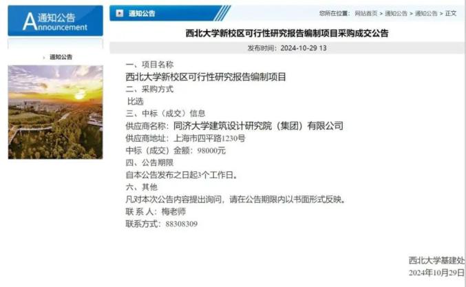 10月29日,西北大學(xué)發(fā)布《西北大學(xué)新校區(qū)可行性研究報(bào)告編制項(xiàng)目采購成交公告》,正式公布由同濟(jì)大學(xué)建筑設(shè)計(jì)研究院(集團(tuán))有限公司中標(biāo)。