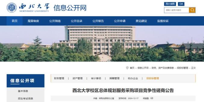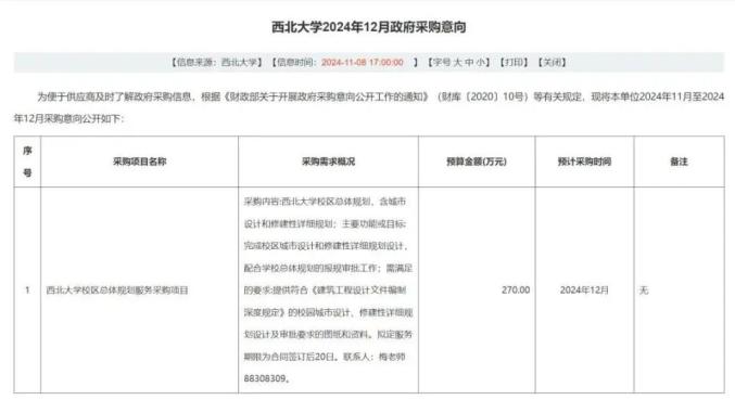 11月8日,西北大學(xué)發(fā)布采購意向,計(jì)劃在12月進(jìn)行《西北大學(xué)校區(qū)總體規(guī)劃》的采購,進(jìn)行西北大學(xué)校區(qū)總體規(guī)劃的編制,完成校區(qū)城市設(shè)計(jì)和修建性詳細(xì)規(guī)劃設(shè)計(jì)。